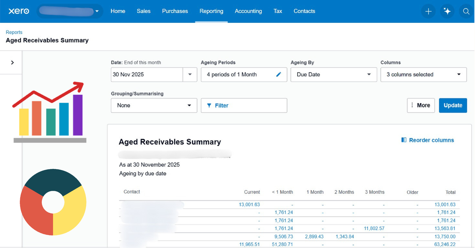 - Receivables aging summaries (0–30, 30–60, 60+ days)