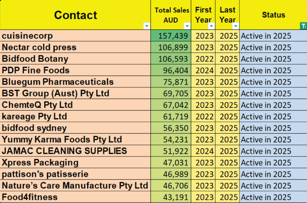 •A clear list of inactive customers who stopped buying after certain years, ideal for reactivation.