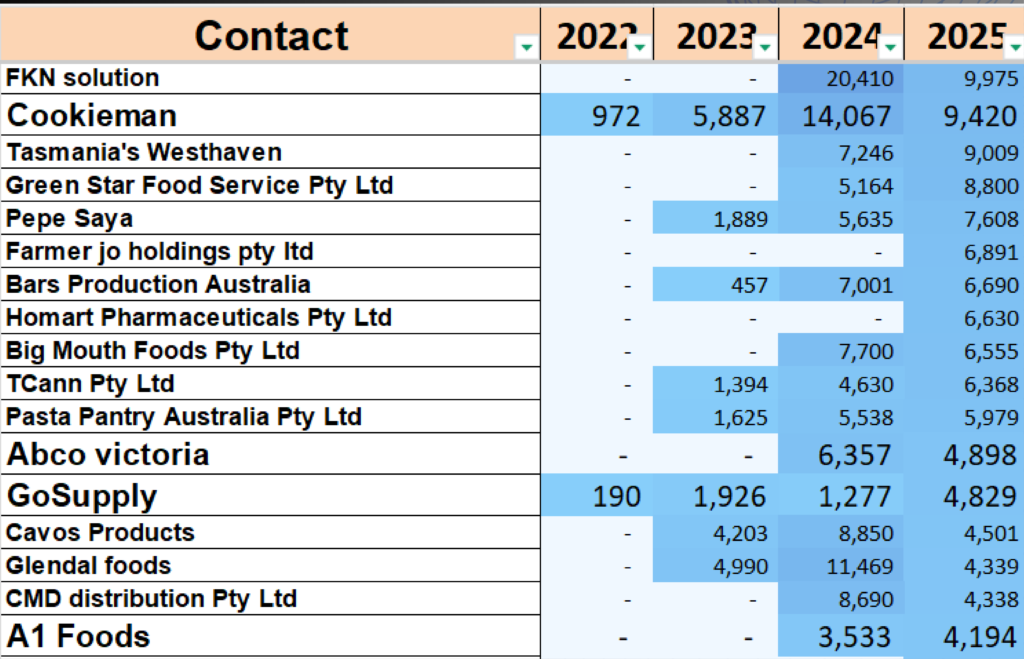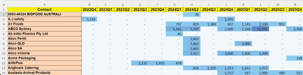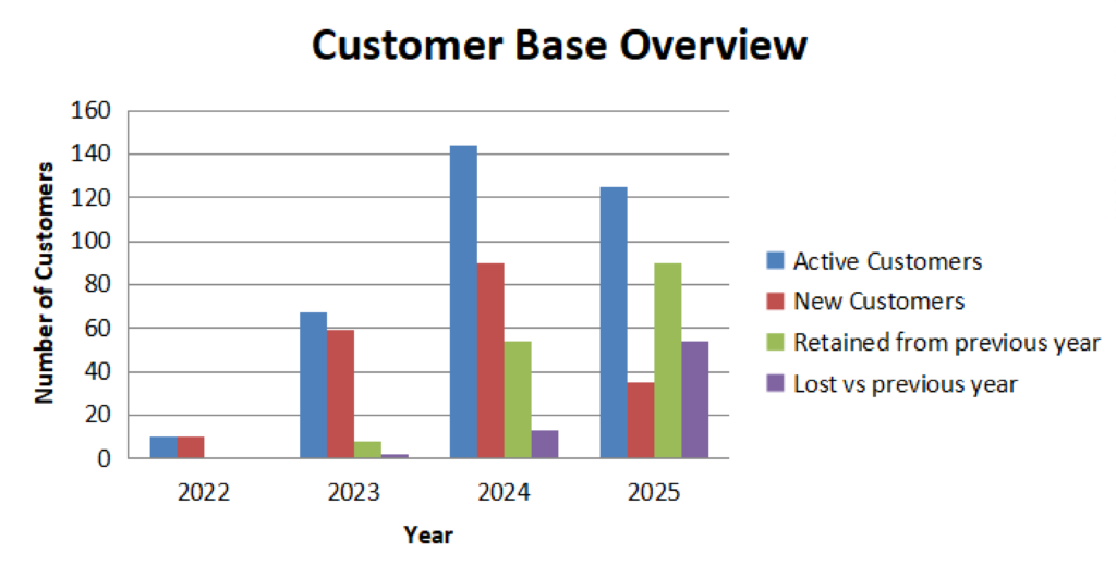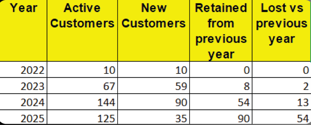 • A matrix with customers as rows and years as columns (2022- 2025)